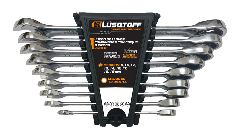 • Dureza HRC 40-50• Cromo vanadio• Medidas grabadas• Crique de 72 dientes• Incluye organizador• Medidas: 8, 10, 12, 13, 14, 16, 17, 18, 19 mm
